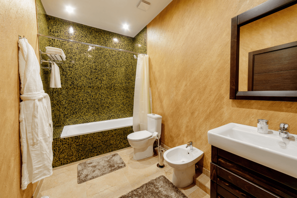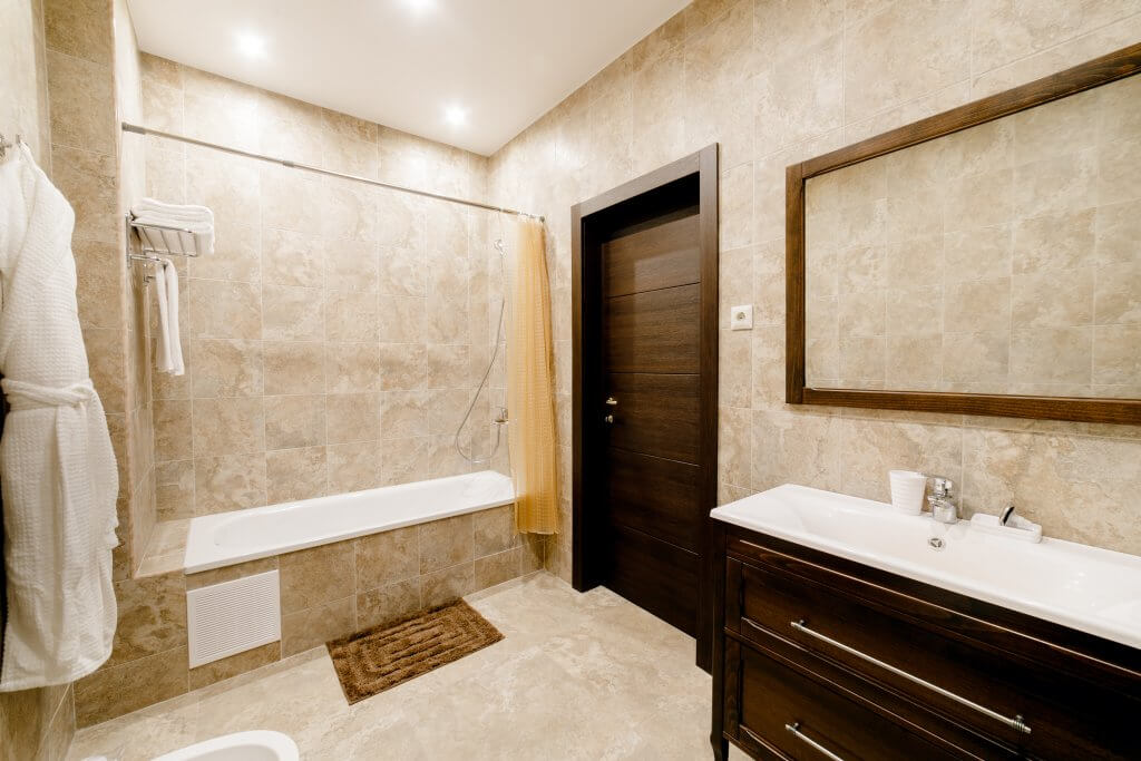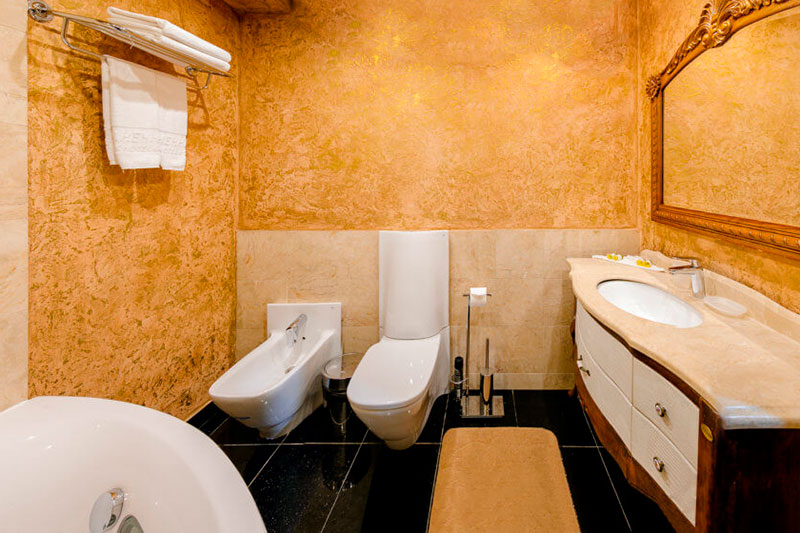 Две спальни – одна двуспальная кровать в каждой, гостиная (проходная комната) – раскладной диван (2 доп. места). Возможна установка доп. детской кроватки-люльки для младенца в спальне. В номере сейф, мини-бар за доп. оплату, 3 плазменных ТВ (в каждой спальне и в гостиной), два санузла (в каждой спальне). В каждом санузле: ванна, раковина, унитаз, беде, набор косметики, фен, халаты и тапочки. В одном из санузлов дополнительно душевая кабина.