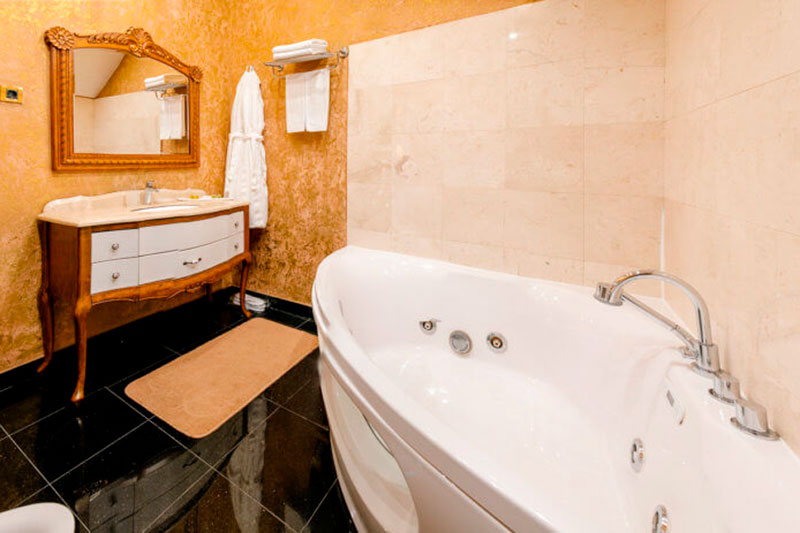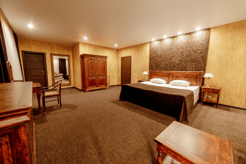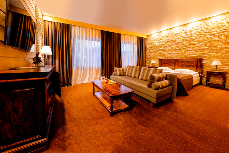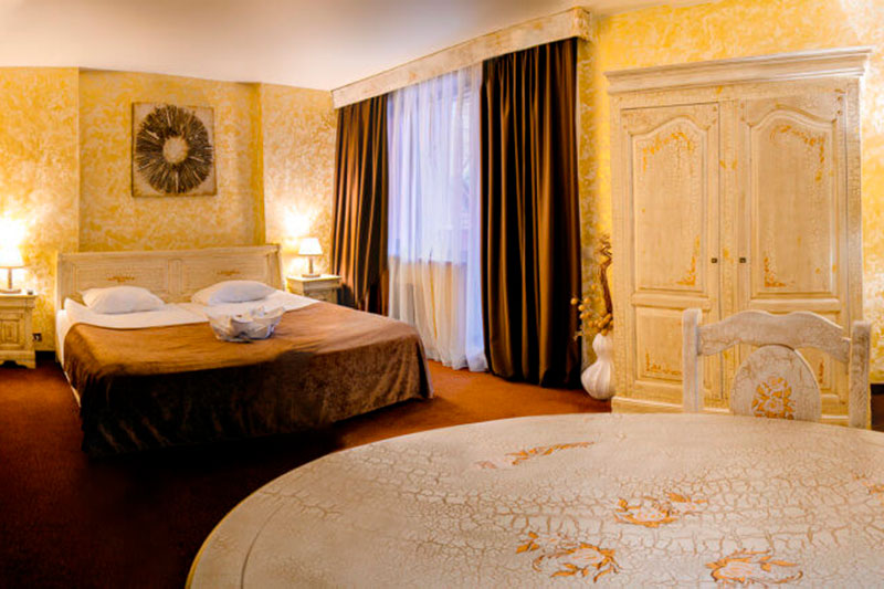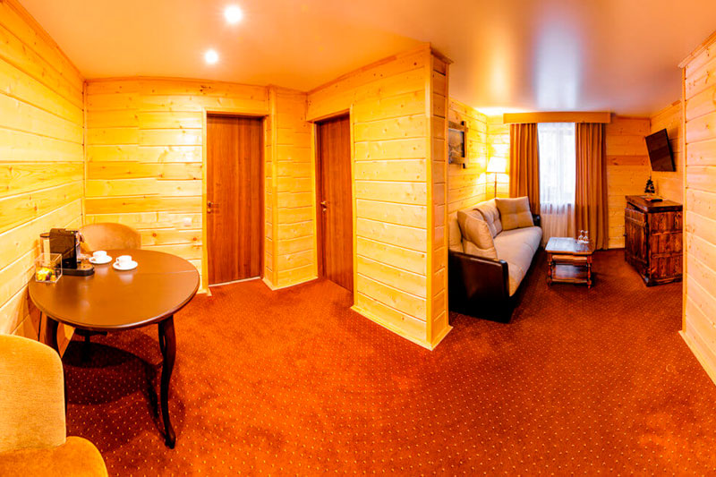 В спальне – одна двуспальная кровать, шкаф, в гостиной (проходная комната) установлен раскладной диван (2 доп. места). Возможна установка 1 доп. детской кроватки-люльки для младенца в спальне. В номере сейф, мини-бар за доп. оплату, 2 плазменных ТВ, в санузле ванная, набор косметики, фен, халаты и тапочки. Номера расположены на 1-3 этажах (лифта нет).