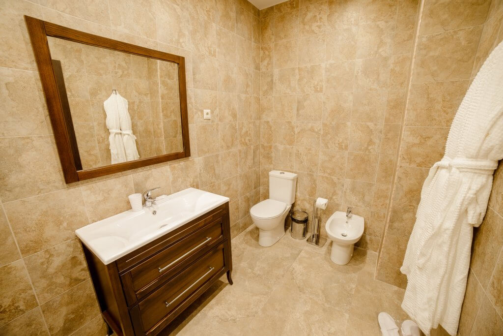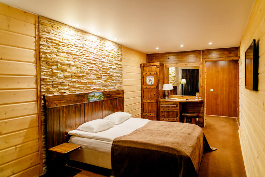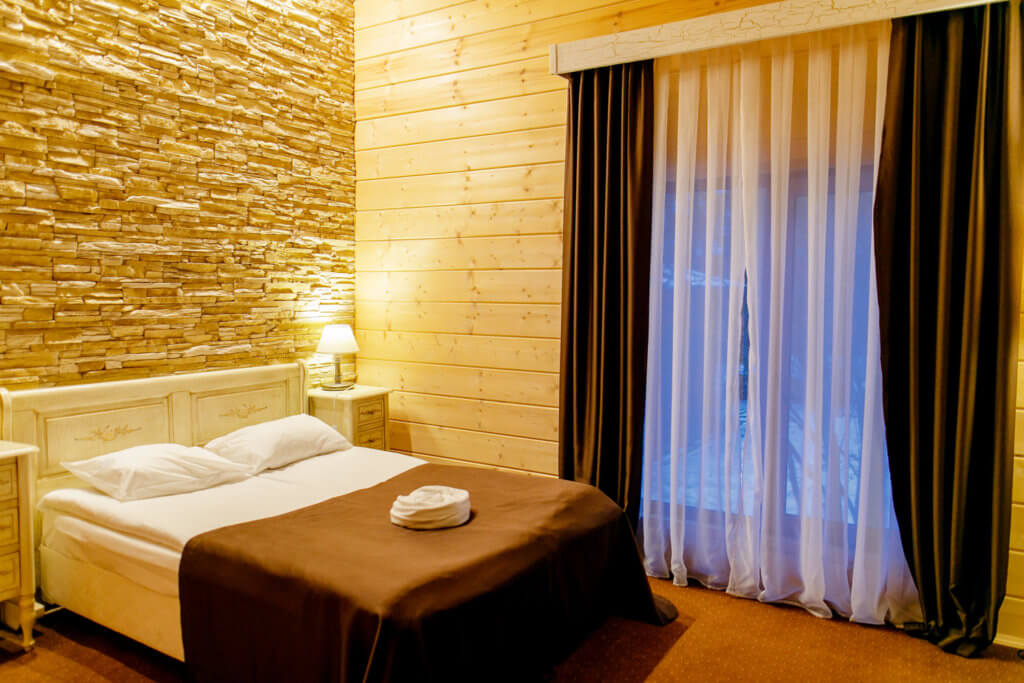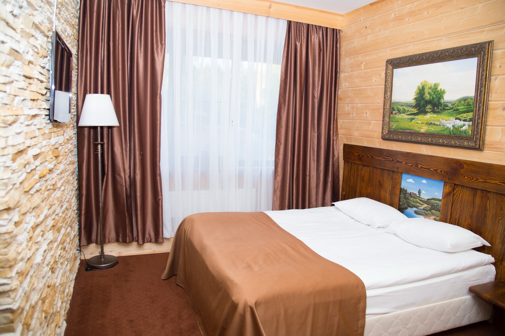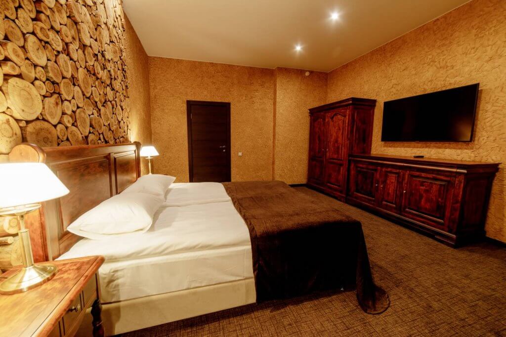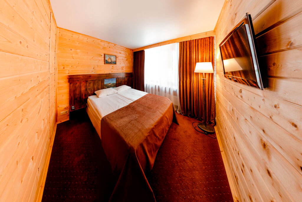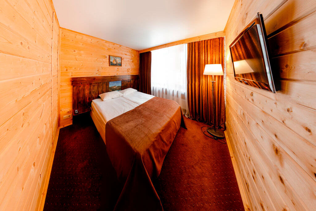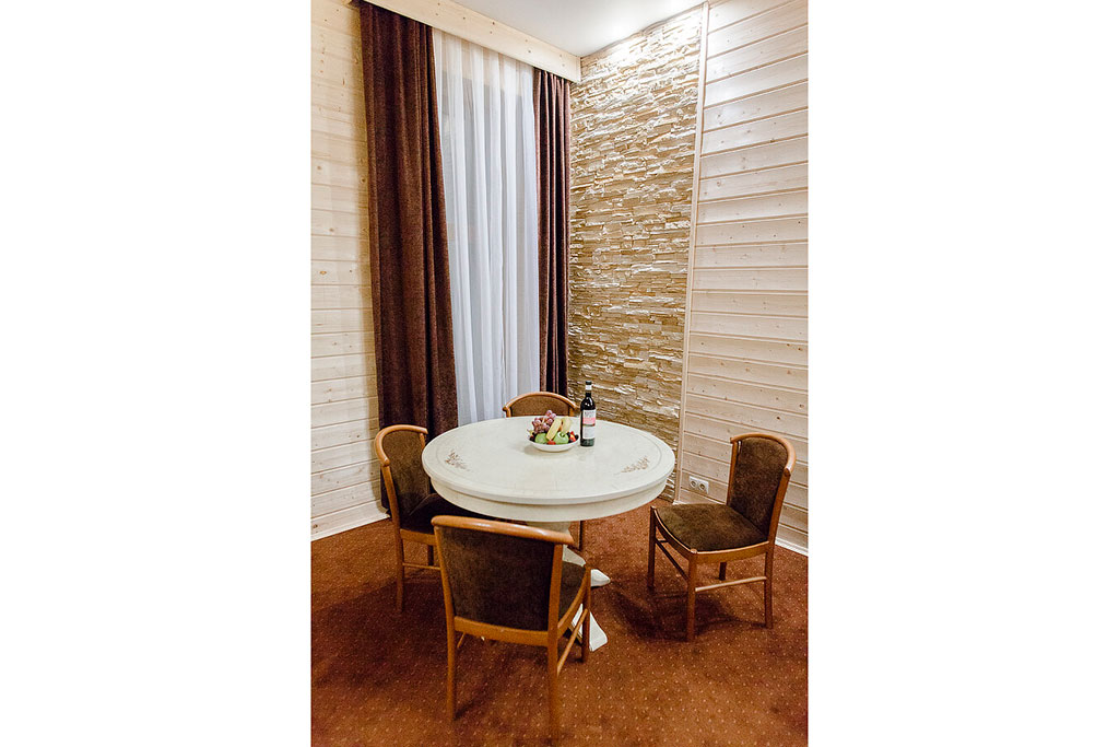 Одна двуспальная кровать и раскладной диван (2 доп. места). В номере сейф, мини-бар за доп. оплату, плазменный ТВ, в санузле ванная, набор косметики, фен, халаты и тапочки. Возможно поставить 1 детскую кроватку-люльку. Номера расположены на 1-3 этажах (лифта нет).