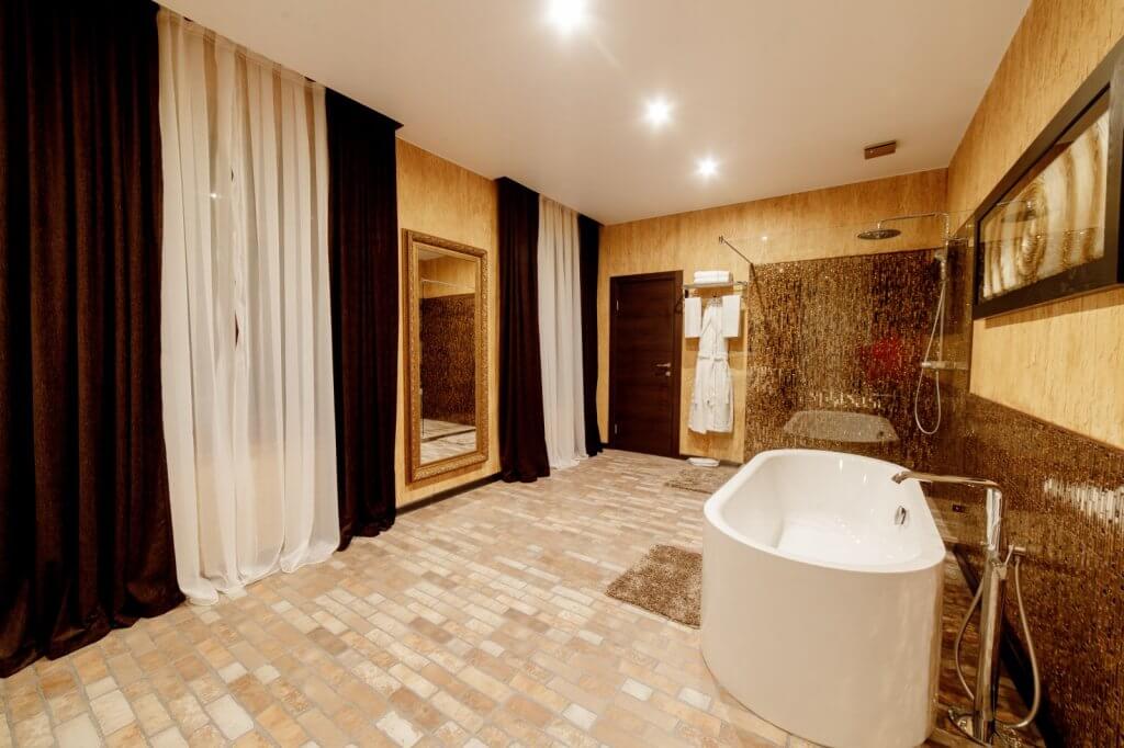 Спальня – одна двуспальная кровать. Гостиная (проходная комната) – раскладной диван. В номере сейф, мини-бар за доп. оплату, 2 плазменных ТВ, в санузле ванная, набор косметики, фен, халаты и тапочки.