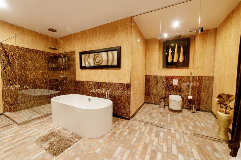 Три спальни – одна двуспальная кровать в каждой, две гостиные (проходные комнаты) – в одной из гостиных стоит длинный стол на 6 персон, во второй раскладной диван-уголок (2 доп. места). В номере сейф, мини-бар за доп. оплату, 4 плазменных ТВ (в спальнях и в гостиной), четыре санузла – три основных и один гостевой (в основных – в двух джакузи, набор косметики, фен, халаты и тапочки, в одном – ванная, набор косметики, фен, халаты и тапочки, в гостевом – раковина, унитаз).