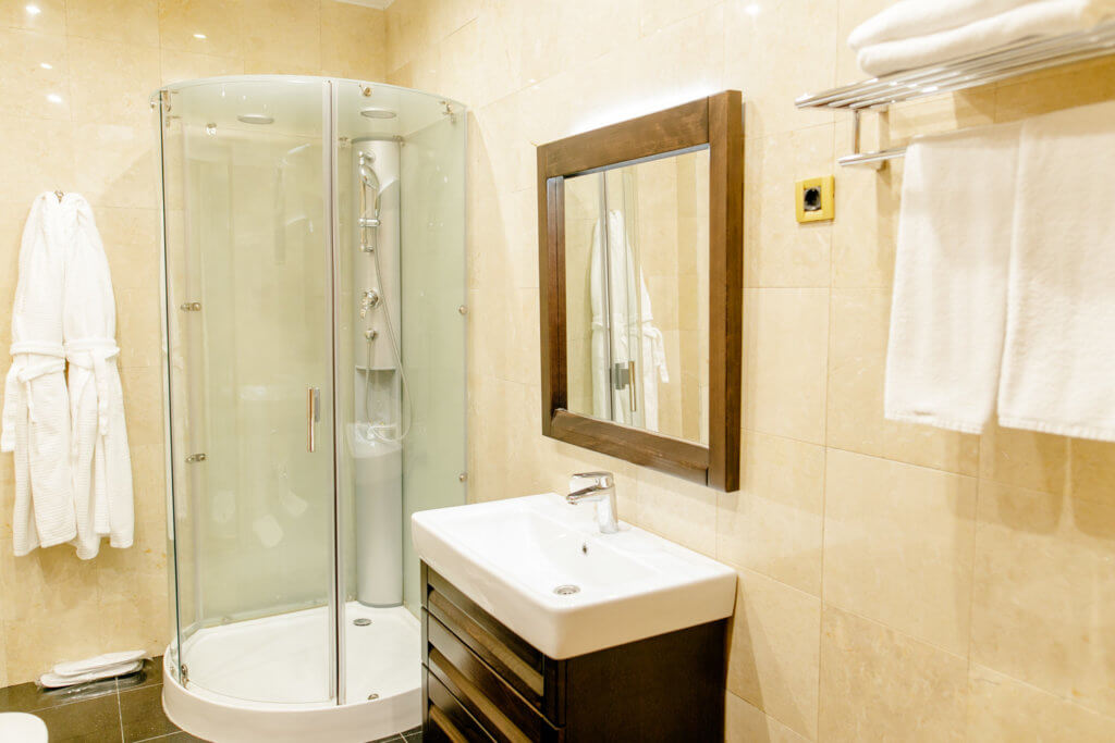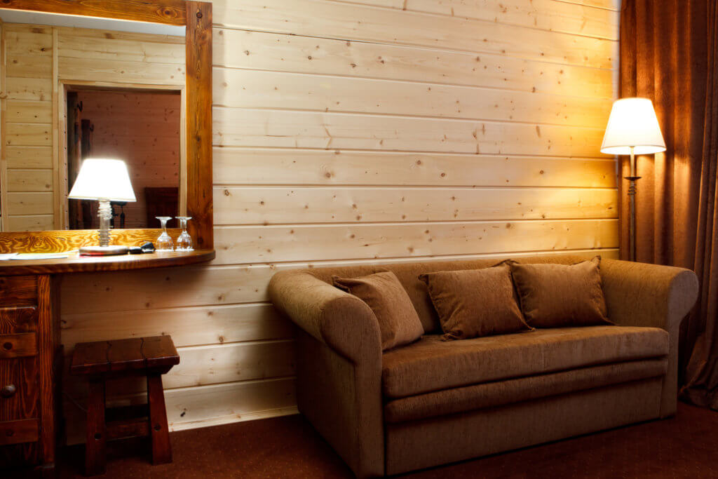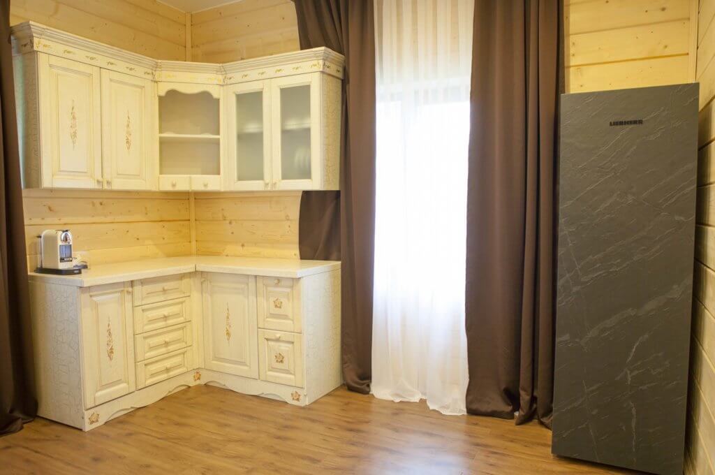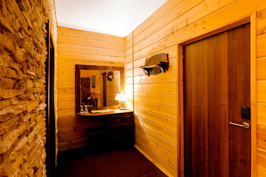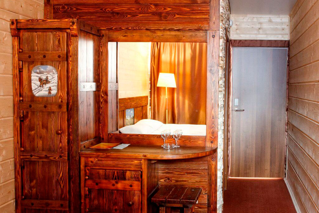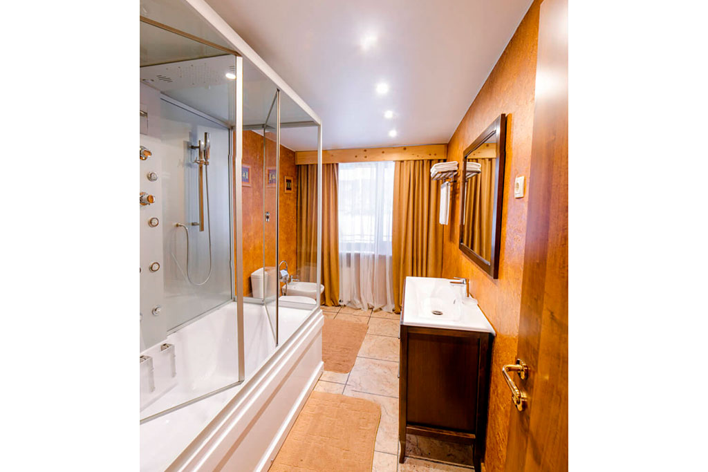 1 этаж: гостиная со столом на 4 персоны, раскладной диван, санузел (ванна, унитаз, биде). 2 этаж: спальня с двуспальной кроватью, раскладной диван, гардеробная и санузел (ванна, унитаз и биде). Возможна установка дополнительного места – еврораскладушки (или детская кроватка-люлька). В номере: сейф, мини-бар, 2 плазменных ТВ (в спальне и в гостиной), два санузла, набор косметики, фен, халаты и тапочки. Теплые полы на 1 и 2 этажах + в санузлах. На втором этаже одно большое центральное окно – не открывается. У каждого номера отдельный вход с улицы.