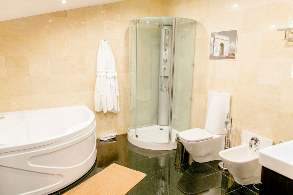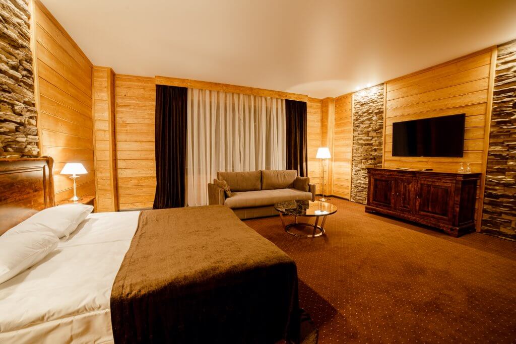 Спальня – одна двуспальная кровать. Гостиная (проходная комната) – раскладной диван. В номере сейф, мини-бар за доп. оплату, плазменный ТВ, в санузле ванная, набор косметики, фен, халаты и тапочки. Возможно поставить 1 доп. место (евро-раскладушка) или 1 детскую кроватку-люльку.
