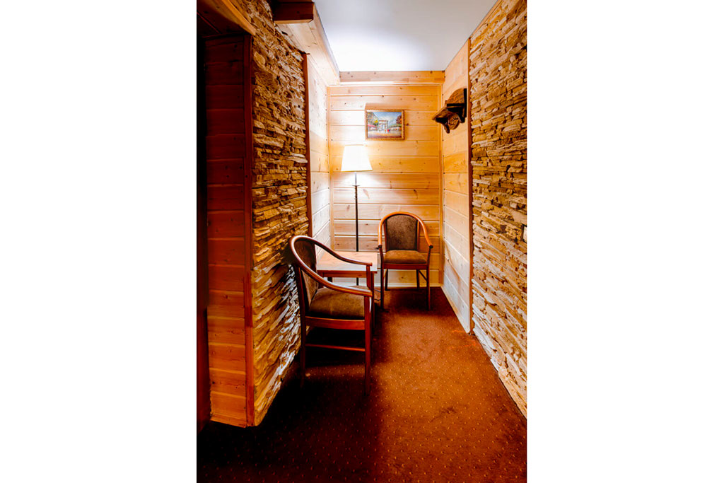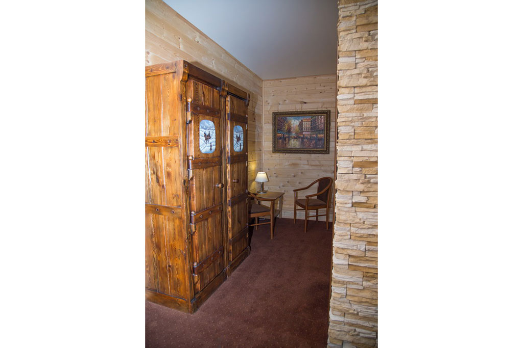 1 этаж: прихожая с зеркалом, зона отдыха с кофейным столиком и стульями, гостиная со столом на 4 персоны, раскладной диван, санузел (ванна, унитаз, биде), гардеробный отсек. 2 этаж: спальня с двуспальной кроватью, раскладной диван, гардеробная и санузел (ванна, унитаз и биде). Возможна установка дополнительного места – еврораскладушки. В номере сейф, мини-бар, 2 плазменных ТВ (в спальне и в гостиной), два санузла, набор косметики, фен, халаты и тапочки. Теплые полы на 1 и 2 этажах + в санузлах. На втором этаже одно большое центральное окно – не открывается. У каждого номера отдельный вход с улицы.