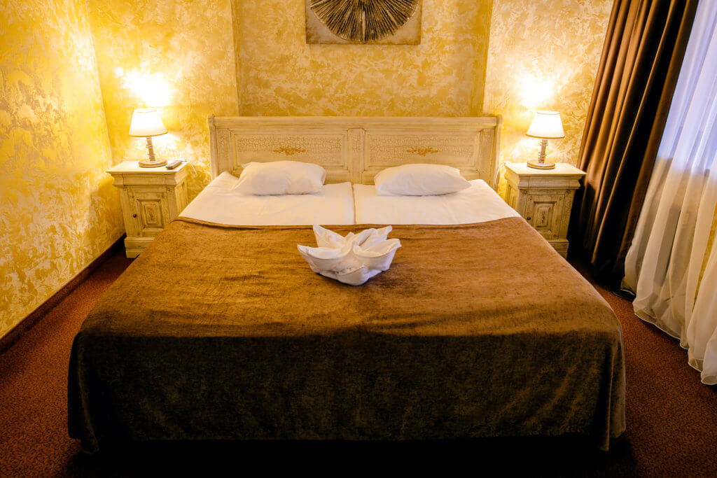 Одна двуспальная кровать. В номере сейф, мини-бар за доп. оплату, плазменный ТВ, маленький столик + 2 стула, в санузле ванная, фен, набор косметики, халаты и тапочки. Просторный санузел с окном. Возможно поставить 1 доп. место (евро-раскладушка) или 1 детскую кроватку-люльку.